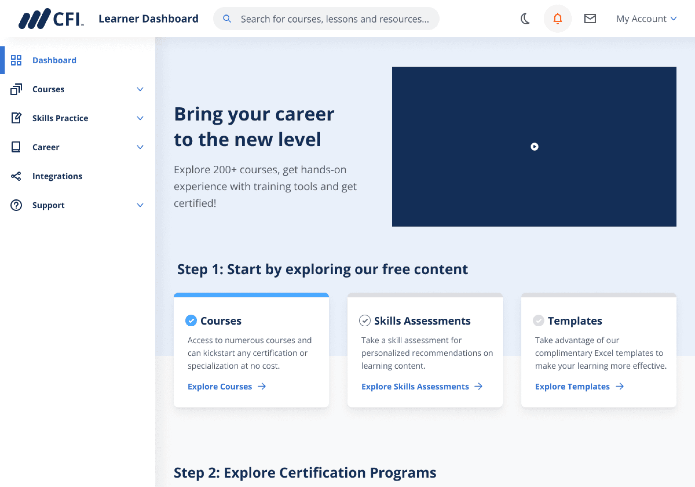 In collab with Product Manager I added a 3-step guide to the homepage helping learners getting started with CFI