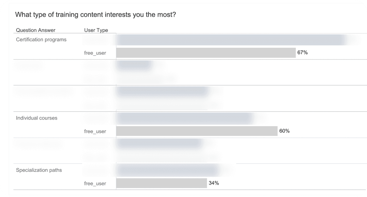 I found that 67% of learners were interested in certifications, but only 34% in specializations.